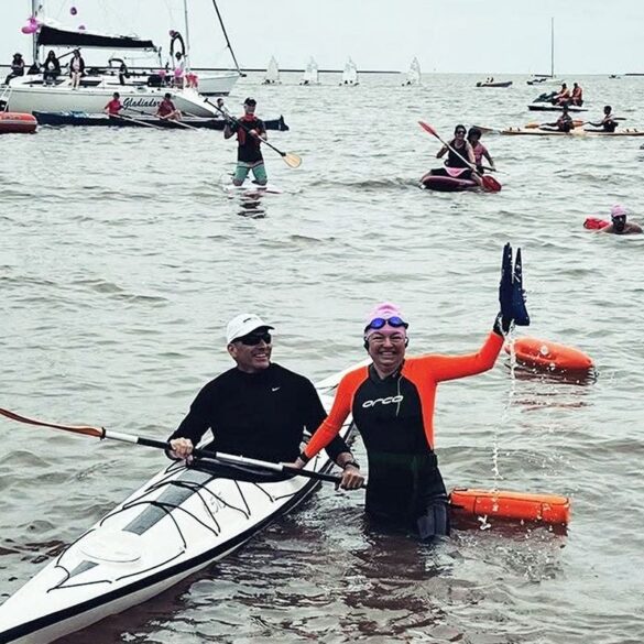“Cuando me sentí mejor fui a ver a un traumatólogo, porque de tanto sedentarismo, me dolía mucho la cintura. Me pidió unos estudios y me dijo que no tenía nada importante, solo una gran contractura por estar tanto tiempo sin moverme. Así que me recomendó empezar alguna actividad física como pilates, yoga o natación. Y yo elegí natación”, sigue Anila. Arrancó a nadar de a poco, y en algunas semanas comenzó a notar grandes mejoras respiratorias. Sin embargo, después de algunos años encerrada en su casa, ansiaba un poco más de libertad, y esas ganas de salir afuera la llevaron a incursionar por primera vez en las aguas abiertas del río Uruguay. “A los dos meses de empezar a nadar me anoté en la travesía de aguas abiertas de 2,2 kilómetros Liebig- San José, en Entre Ríos, sobre el río Uruguay.