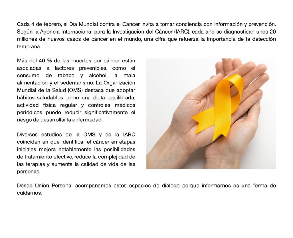 Wellness Día Mundial del Cáncer: la importancia de la detección temprana por Claudia Acosta febrero 19, 2026 publicado por Claudia Acosta febrero 19, 2026 2 Cada año, hay unos 20 millones de nuevos casos en el mundo. Evitar el consumo de tabaco y alcohol, el sedentarismo y la mala alimentación es clave en la prevención. Fuente: Unión Personal Foto de Tara Winstead: https://www.pexels.com/es calidad de vidacáncercuidadosdetecciòn tempranaprevenciónsaludUnión Personal 0 comentarios 0 FacebookTwitterPinterestEmail Claudia Acosta publicación anterior San Valentín: 14 de febrero Publicaciones relacionadas Voces Vitales:Caminata de Mentoreo 2026 febrero 6, 2026 Salud:El 4 de febrero es el Día Mundial contra el Cáncer febrero 5, 2026 AEDROS: Convocatoria a Capacitadores 2026 noviembre 15, 2025 Mujeres Al Volante: TALLER GRATUITO «MANEJATE» junto a Women by Stellantis octubre 2, 2025 Teatro: Pata Liberati «Emocional» septiembre 19, 2025 Sustentabilidad: ¿Qué estamos haciendo para evitar caer en #Greenwashing? septiembre 10, 2025 Cámara de Comercio e Industria Franco-Argentina: desayuno de la Comisión Género, Diversidad e Inclusión septiembre 5, 2025 Premios FLOR a la Diversidad 2025 – 10ma Edición septiembre 3, 2025 Museo Bellas Artes: Nuevas exposiciones agosto 21, 2025 Sustentabilidad sin Fronteras: julio 28, 2025 Deja un comentario Cancel Reply Save my name, email, and website in this browser for the next time I comment.